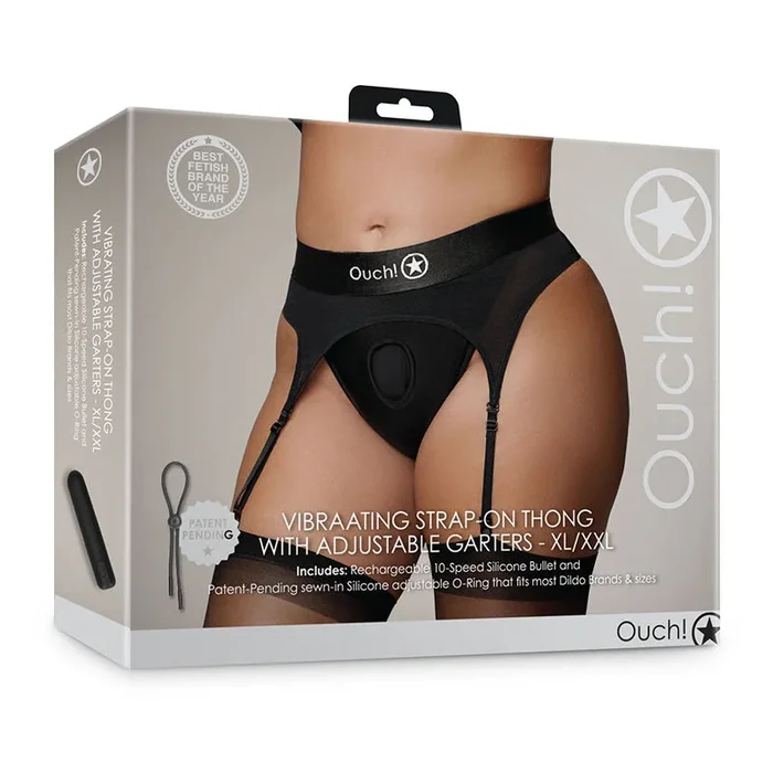 Shots Ouch! Vibrating Strap-on Thong with Adjustable Garters Black XL/2XL