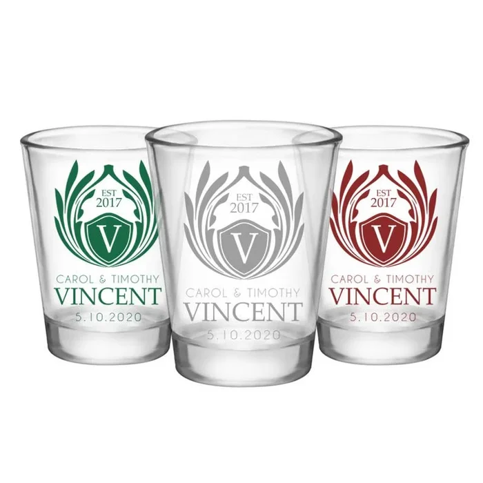 CUSTOMIZABLE – 1.75oz Clear Wedding Shot Glass – Crest (Version 1)