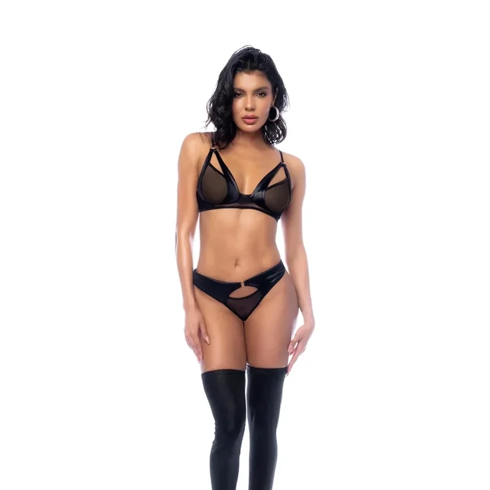 Mapale Lingerie Black Wet Look Mesh Contrast Two Piece Set – Semi-Open Cup and Open Back Panty