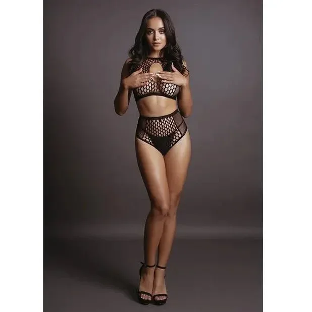 Three piece nurse set. Mesh and strappy elastic bustier, open crotch panty, and headpiece.