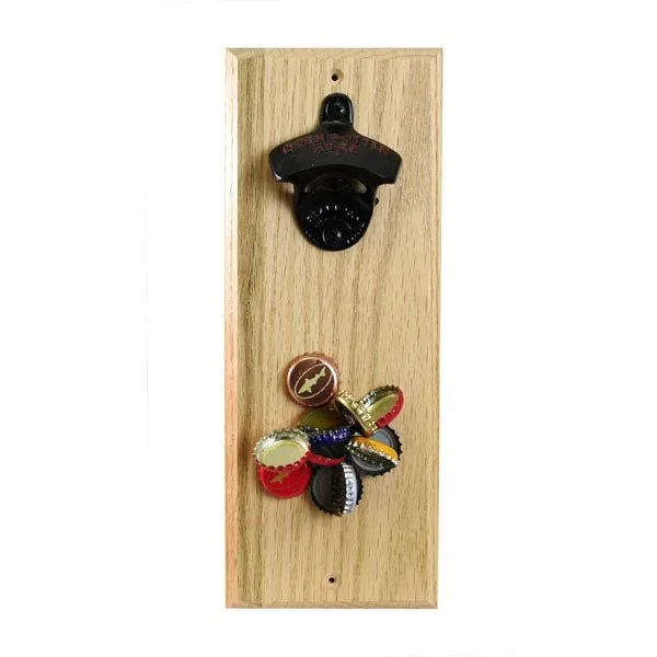 - Strong magnet inside wood catches bottle caps as they fall