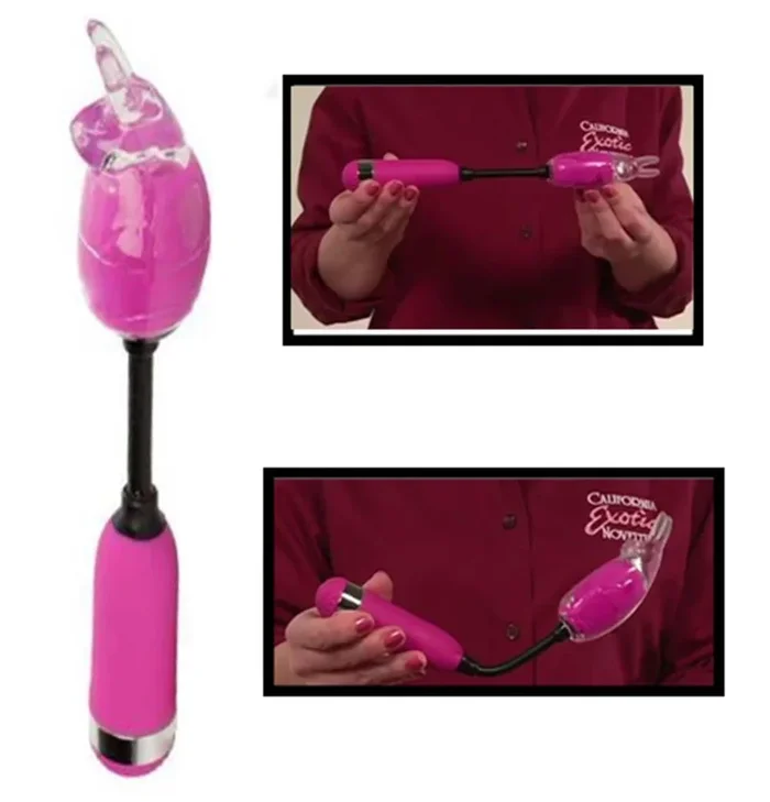 Bendable massager that flexes and maintains perfect position. Multi-speed and powerful. Removable soft bunny sleeve for versatile use. TPE (bunny), ABS with PU Cote (controller and vibrating bullet), PVC (bendable neck), ABS with Silver Plating (ring). 2 AAA batteries. 10.75x 1.5/ 27 cm x 4 cm (overall). 4x 1.5/ 10 cm x 4 cm (bunny).